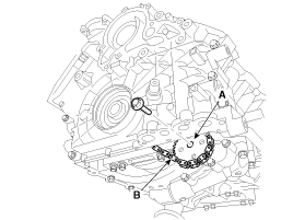 Install the oil pump sprocket (A) with the chain (B) to the oil pump.