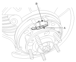 Remove the shoe hold down pin (A) and the spring (B) by pushing the retainer spring and turning the pin.