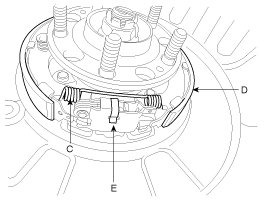 Remove the adjuster assembly (B) and the lower return spring (A).