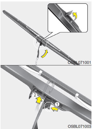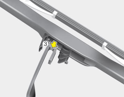 4. Push down the wiper arm (3) and install the new blade assembly in the reverse
