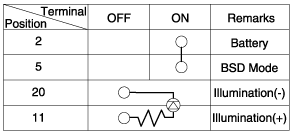 Operate the BSD switch, then check for continuity between terminals of BSD switch connector.
