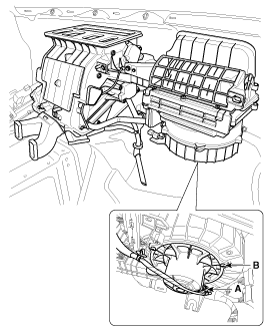 Disconnect the blower motor connector (A) and then remove the blower motor (B) after loosening the screws.