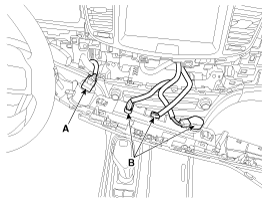 Disconnect the heater and A/C controller connector (A) and start connector (B).