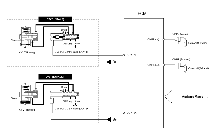 the CVVT Oil Control Valve (OCV) which supplies the engine oil to the cam phaser or runs out the engine oil from the cam phaser in accordance with the ECM PWM (Pulse With Modulation) control signal,