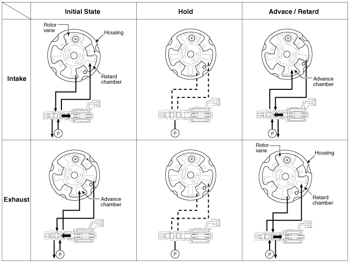 The engine oil getting out of the CVVT oil control valve varies the cam phase in the direction (Intake Advance/Exhaust Retard) or opposite direction (Intake Retard/Exhaust Advance) of the engine rotation by rotating the rotor connected with the camshaft inside the cam phaser.