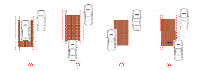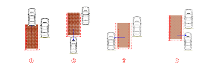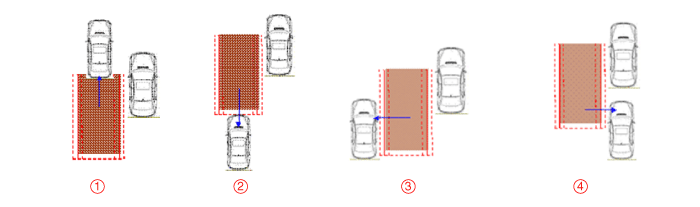 The entire body of the target vehicle is located behind the line A. Any part of the target vehicle pass the line B. Any part of the target vehicle passes the line D and Hysteresis In. The entire part of the target vehicle passes the line E and Hysteresis In.