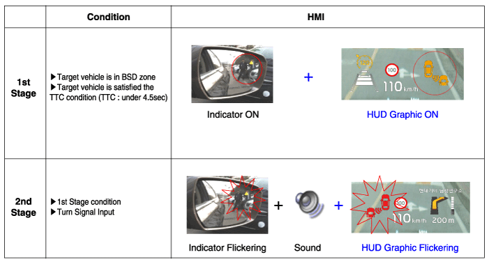 BSD & LCA switch (indicated by the switch LED) is on. Vehicle Speed: 15km/h or faster Curvature radius: 100m or more Relative car speed: All except -10 ~ 250x/h("-" means overtaking the preceding vehicle) |