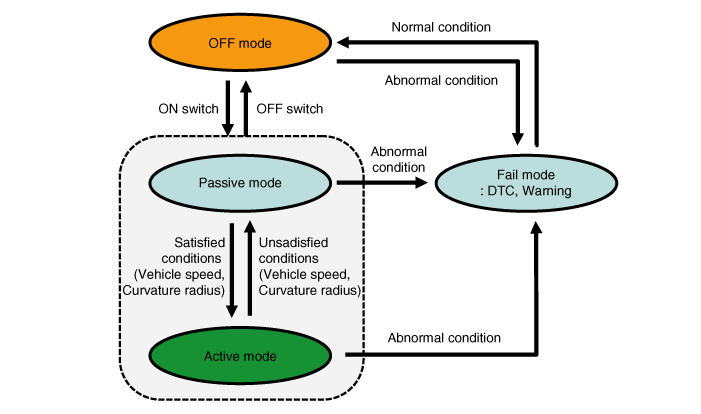 If the activation conditions (speed and curvature radius) are not met while driving, Passive mode is on (warning removed). |