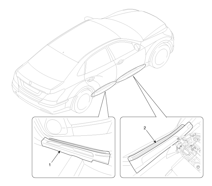 Components 1. Cowl side trim2. Front door scuff trim3. Center pillar lower trim4. Rear door scuff trim5. Rear pillar trim6. Rear wheel house trim7. Rear package tray trim 8. Front pillar trim ...