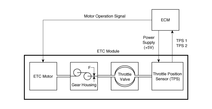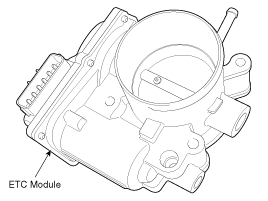 The Electronic Throttle Control (ETC) System consists of a throttle body with an integrated control motor and throttle position sensor (TPS). Instead of the traditional throttle cable, an Accelerator Position Sensor (APS) is used to receive driver input. The ECM uses the APS signal to calculate the target throttle angle; the position of the throttle is then adjusted via ECM control of the ETC motor. The TPS signal is used to provide feedback regarding throttle position to the ECM. Using ETC, precise control over throttle position is possible; the need for external cruise control modules/cables is eliminated.