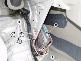 Remove the external amplifier after disconneting the connector (A) and loosening the mounting nuts (B).