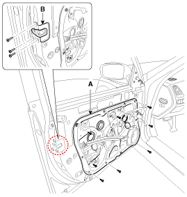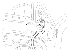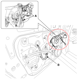 Disconnect the connectors (A) and front door module wiring harness (B) from the front door module.