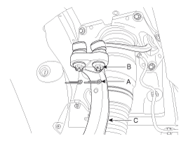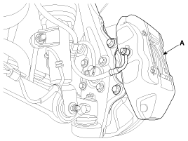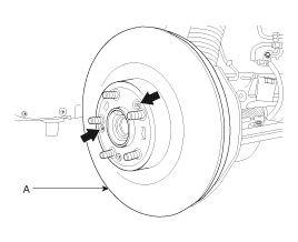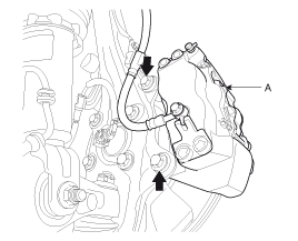 Remove the brake caliper mounting bolts, and then hold the brake caliper assembly (A) with wire.