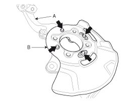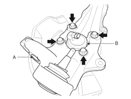 Loosen the dust cover mount bolts and then remove the dust cover (B) from knuckle (A).