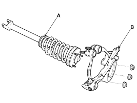 Disconnect the bracket (B) with the front strut assembly (A) loosening the nuts.