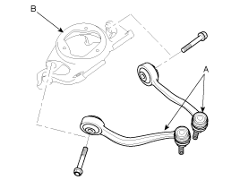 Disconnect the front upper arm (A) with the front strut assembly bracket (B) by loosening the bolt.