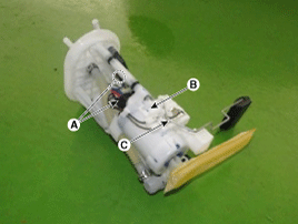 Lift the fixing hook (B) by using a common driver, and then remove the fuel sender (C).