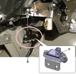 Loosen the bolt (A-2ea) and bracket nut (B-2ea) and disconnect connector (C) remove the G-sensor (D).