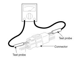 When using a circuit tester to check continuity or voltage on connector terminals, insert the test probe into the harness side. If the connector is a sealed connector, insert the test probe through the hole in the rubber cap until contacts the terminal, being careful not to damage the insulation of the wires.