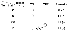 Operate the HUD switch, then check for continuity between terminals of HUD switch connector.