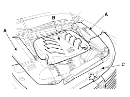 Remove the engine room cover (A), engine cover (B) and radiator grill upper cover (C).