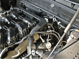 Remove the fuel hose (A), the purge control solenoid valve (PCSV) hose (B) and the brake booster vacuum hose (C).