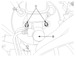 Remove the master cylinder (B) from the brake booster after loosening the mounting nuts (C).