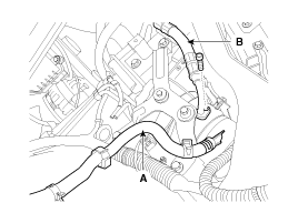 Remove the mounting bolt, pressure hose (A), return hose (B).