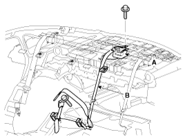 After loosening the retractor (A) mounting bolt, remove the rear center seat belt (B).