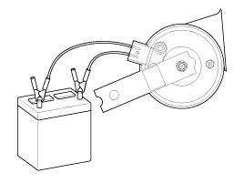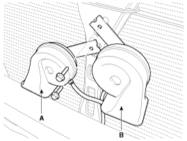 Remove the bolts and disconnect the horn connectors, then remove the high pitch horn (A) and low pitch horn (B).
