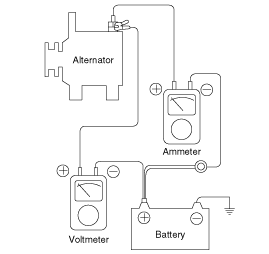 Disconnect the output wire from the alternator "B" terminal. Connect the (+) lead wire of ammeter to the "B" terminal of alternator and the (-) lead wire of ammeter to the output wire. Connect the (+) lead wire of voltmeter to the "B" terminal of alternator and the (-) lead wire of voltmeter to the (+) terminal of battery.