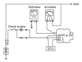 Set the headlamps to high beam and the heater blower switch to HIGH, quickly increase the engine speed to 2,500 rpm and read the maximum output current value indicated by the ammeter.