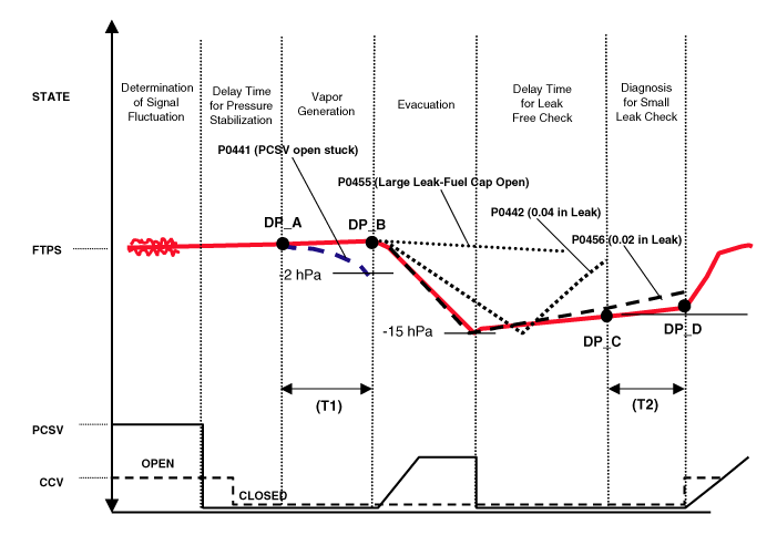 PCSV is closed and the system waits for a period to get stabilized pressure. During checking period (T2), the system measures the beginning and the end of the system pressure (DP_C, DP_D). The diagnosis value is the pressure difference corrected by natural vapor generation (DP_B - DP_A) rate from the vapor generation checking step.
