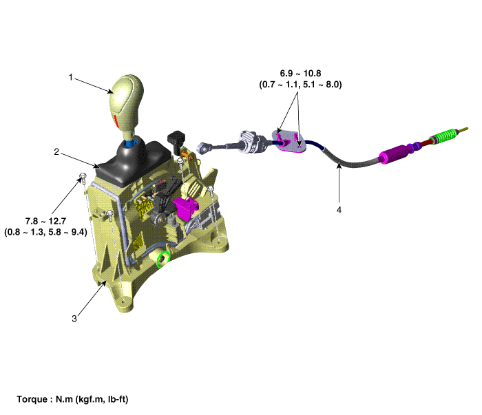 Removal 1. Remove the center console. (Refer to Body - " Floor Consol") 2. Disconnect the sports mode connector (A). 3. Remove the shift cable assembly (A) from the shift lever assembl ...