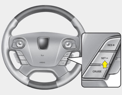 3.Push the SET- switch, and release it at the desired speed. The SET indicator light, set speed and vehicle to vehicle distance on the LCD screen will illuminate. Release the accelerator pedal. The desired speed will automatically be maintained.