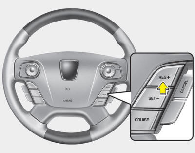 If any method other than the CRUISE switch was used to cancel cruising speed and the system is still activated, the most recent set speed will automatically resume when the RES+ switch is pushed.