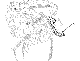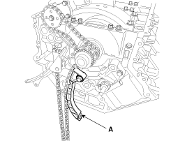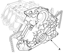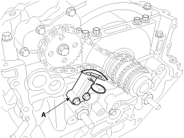 Insert a set pin after compressing the oil pump chain tensioner (A) and then remove the tensioner.