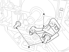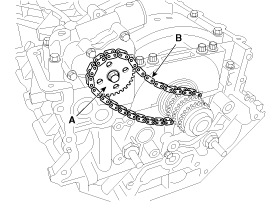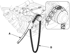 Install the RH timing chain guide (A) and the chain (B). Insert the guide to the fixing pipe of guide bolt with the chain.