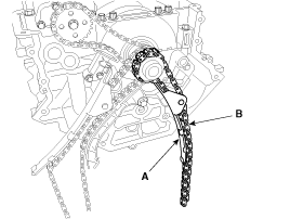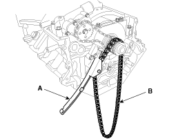 Remove the LH timing chain guide (A) and the chain (B).