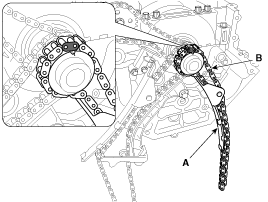 Remove the oil pump sprocket (A) and the chain (B).