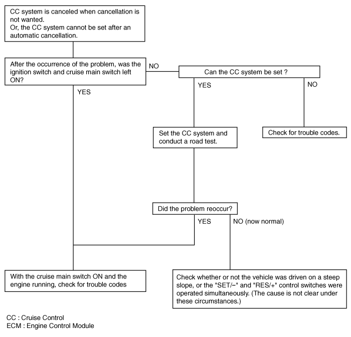 | Cannot decelerate (coast) by using the "SET/–" switch | Temporary damaged or disconnected wiring of "SET/–" switch input circuit | Repair the harness or replace the "SET/–" switch |