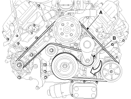 Turn the tensioner (B) clockwise and loosen, then remove the drive belt (A).