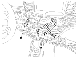 Disconnect the heater control unit connector (A), clock and SSB connector (B).